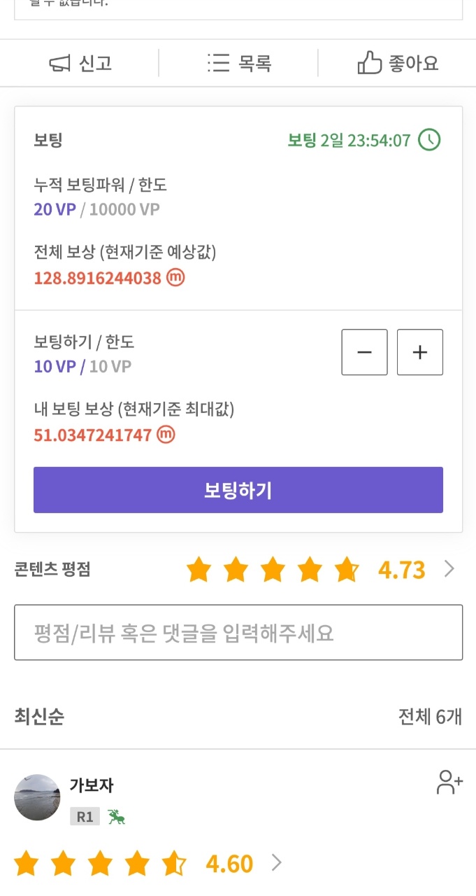 보시는 바와 같이, 주가를 예측해서 맞추거나 예측하는 글에 댓글을 달면 토큰을 주는 클레이튼 기반의 플랫폼입니다. 주식을 하고 계신 분이라면 한 번쯤 생각해보셨을 컨텐츠로 구성된 앱이네요. 유저들은 특정 주식의 하락/보합/상승과 그 이유를 상세히 적어 올립니다. 그럼 우리가 그 글을 읽고 배팅 (앱 내 용어로는 보팅)을 해서 예측이 성공하면 보상을 받기도 하고 아니면 그냥 글에 대한 별점과 댓글만 달아도 하루 일정량의 코인을 받을 수 있습니다. 주린이라면 주식에 대한 정보를 얻으면서, 주식 고수라면 본인의 실력을 뽐내면서 코인을 받을 수 있는 그런 앱이죠 ㅋㅋㅋㅋ 저는 당연히 예측은 못하고 여기저기 배팅하고 댓글 달면서 소량의 코인만 받아내고 있습니다 ㅎ 그래도 꽤 많이 모았는데 얼마나 모았냐면...