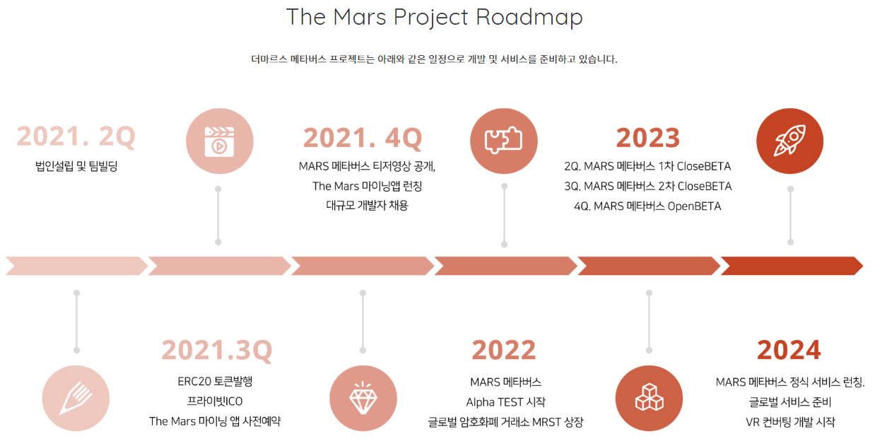 참고로 채굴 앱이 최근에 나와서 그렇지 더 마르스 프로젝트는 무려 2021년 2월에 시작됐습니다. 더 마르스 공식 홈페이지에 공개한 로드맵을 살짝 정리해보자면.