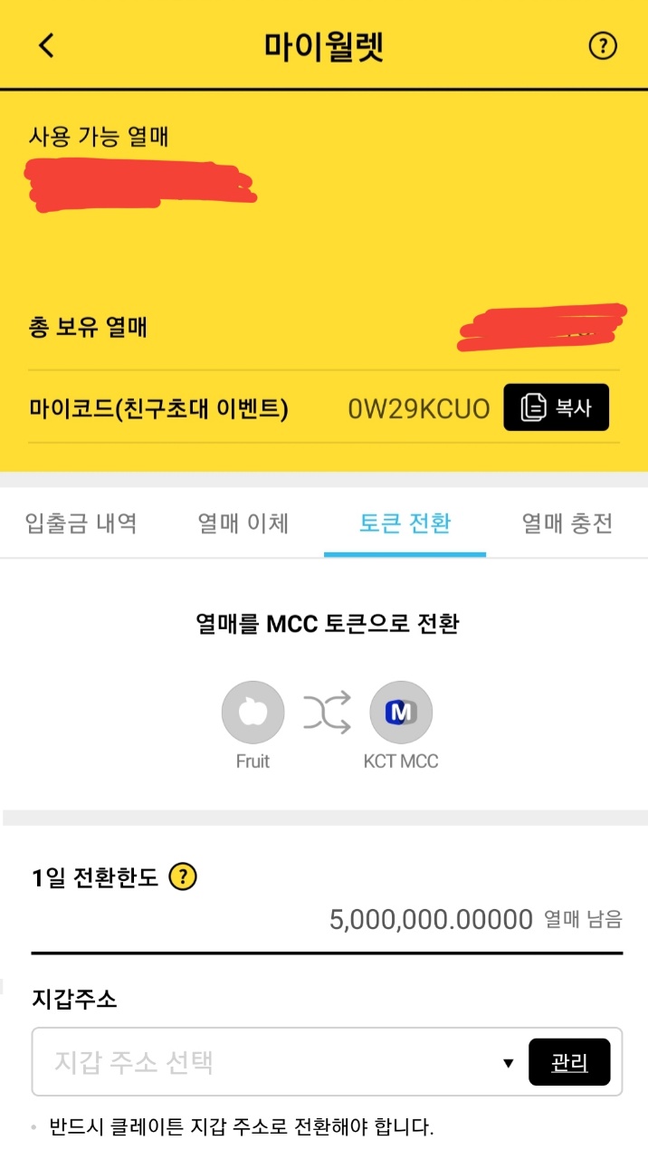 모아놓은 열매는 왼쪽 상단바 - 마이월렛에서 확인하실 수 있으며 목록에 토큰 전환을 누르시면 전환도 가능합니다.